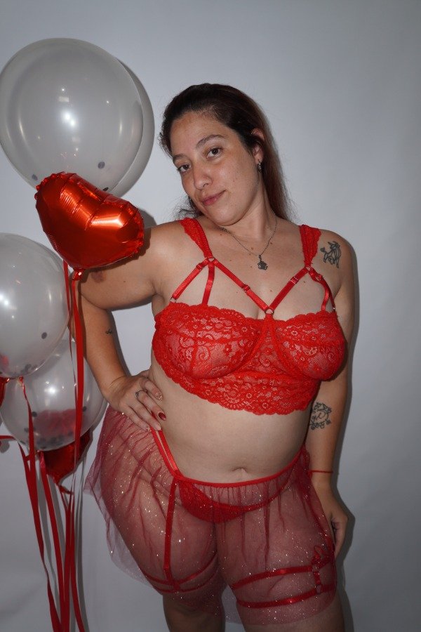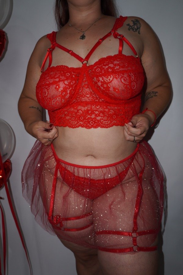Conjunto de puntilla con less regulable y pollera de tul con brillos y ligas